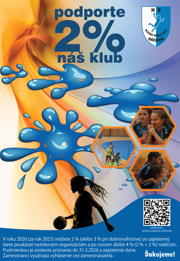 Hadzanársky klub Slovan Duslo Šaľa sa snaží deťom spríjemníť ich voľný čas a popri tom ich niečo naučiť a trochu potrápiť na palubovke. S vaším príspením sa ich aj takouto formou snažíme sprístupniť aj tým deťom , ktoré sú zo sociálne slabších pomerov. Preto si vás dovoľujeme touto cestou osloviť o príspevok 2 % daní pre náš klub.